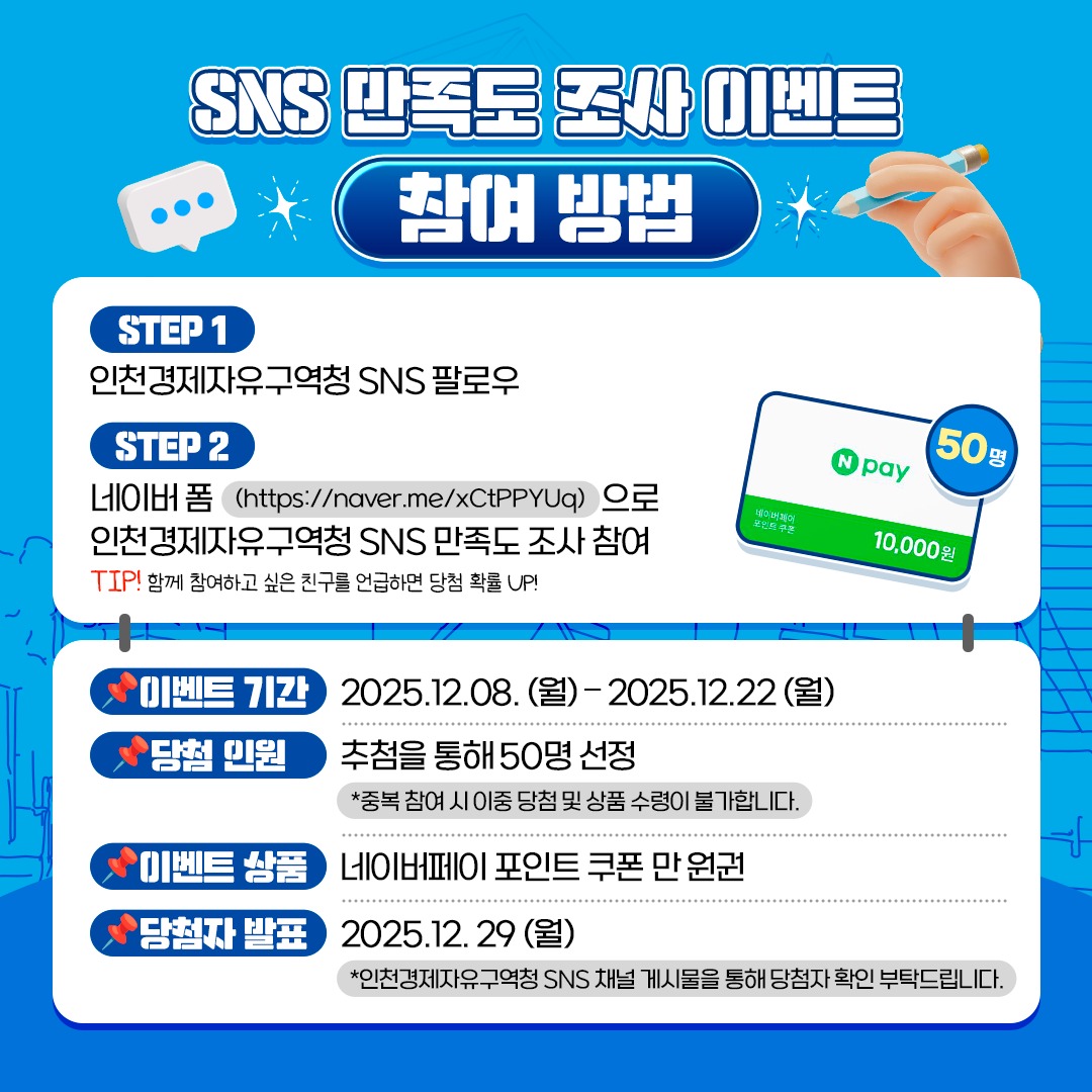 2️⃣ 네이버폼(https://naver.me/xCtPPYUq)으로 인천경제자유구역청 SNS 만족도 조사 참여