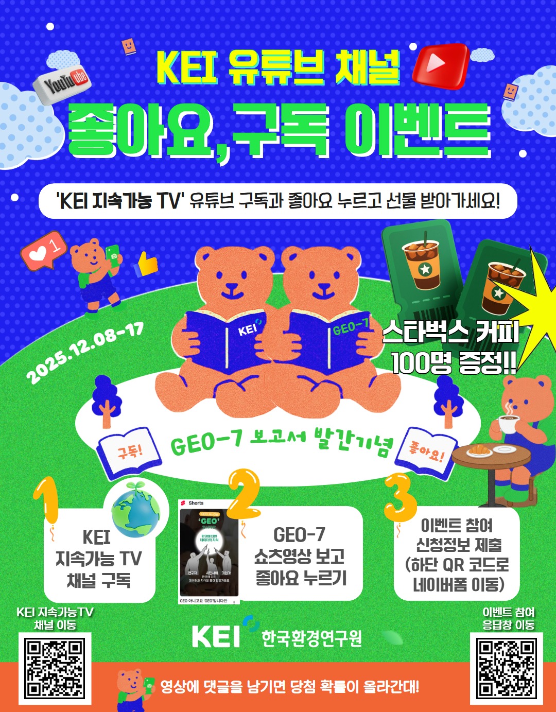 🎁[이벤트] 한국환경연구원 Youtube 지속가능 TV ‘GEO-7 쇼츠’ 시청 및 구독과 좋아요 누르고 선물 받아가세요!🎉